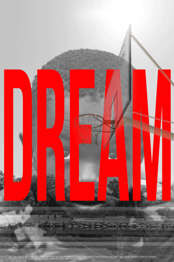 This graphic piece features a young boy gazing upward at a basketball hoop, captured in a black-and-white color palette to evoke a sense of focus and timelessness. Positioned boldly across the image is the word DREAM, rendered in striking red, modern typography. The contrast between the monochrome background and the vivid lettering draws immediate attention to the message, reinforcing the idea that ambition and vision start young. This design is meant to inspire—reminding viewers that big dreams often begin with small, determined steps. Through its minimal color use and powerful composition, the piece speaks to resilience, hope, and the boldness of chasing goals.